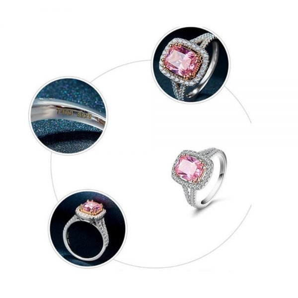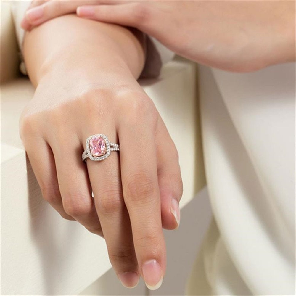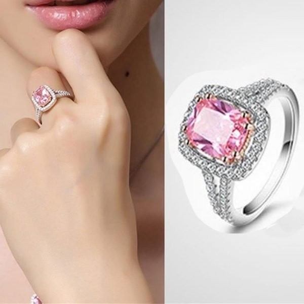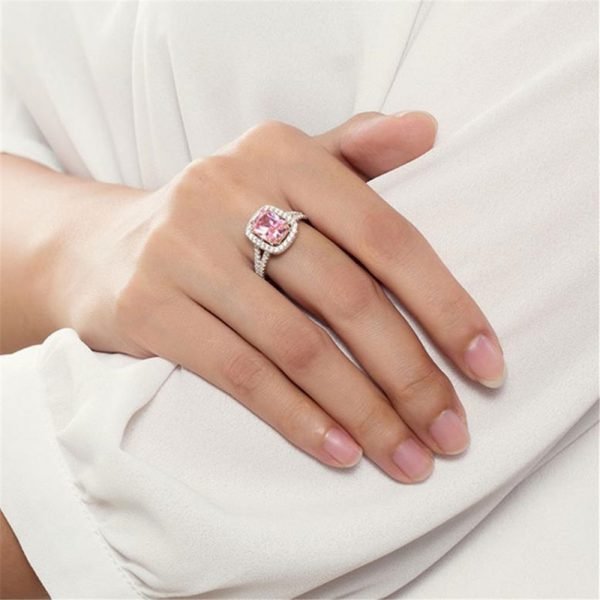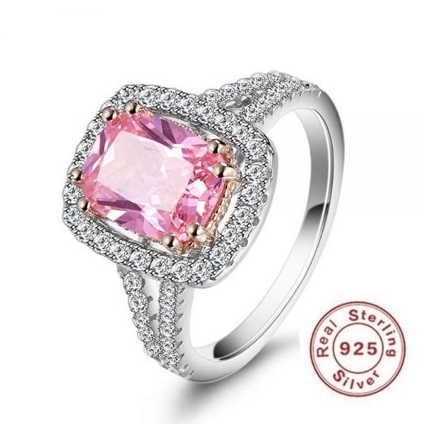 Rectangular pink gemstone ring in sterling silver surrounded by an array of beautiful synthetic diamonds that is sure to catch the eye. This romantic pink gemstone ring is timeless and luxuriously crafted to last an eternity. The surrounding Diamonds Highlight the gemstone beautifully. This ring would make the ideal engagement ring or anniversary gift.