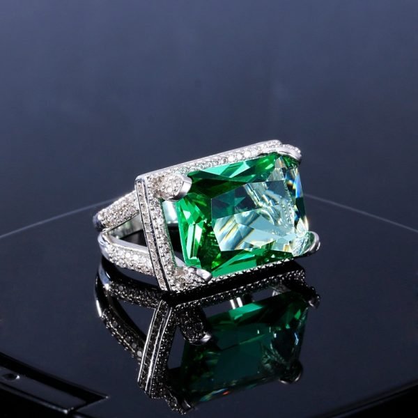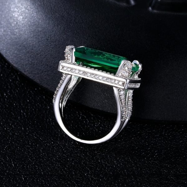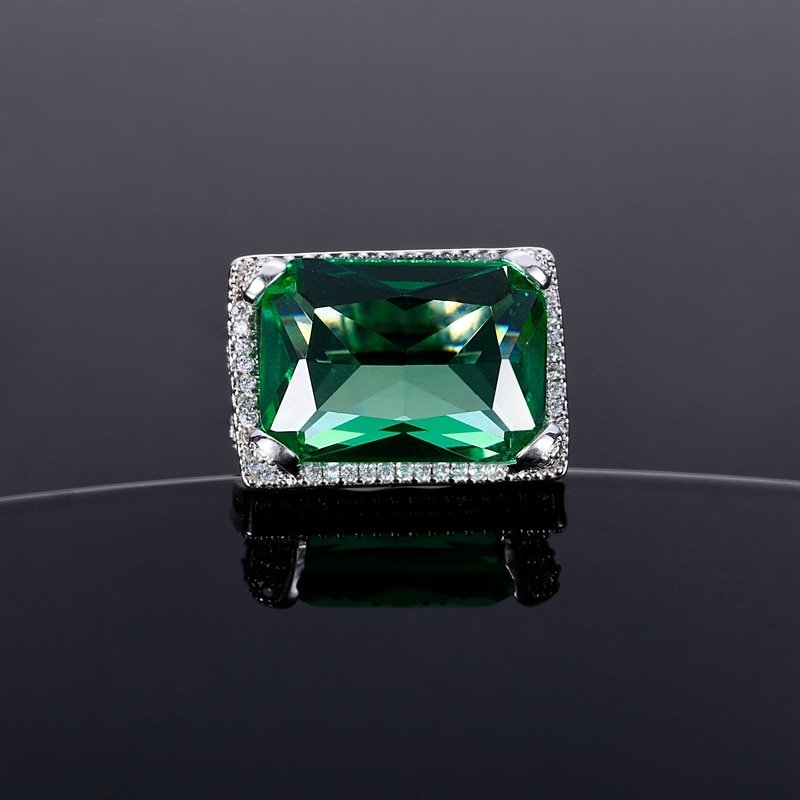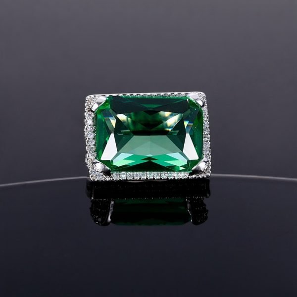 An all-time classic, stylish and elegant rectangular lab-created emerald stone ring surrounded by synthetic Diamonds. One of the larger ring stones in our collection which will turn heads wherever you go.  This romantic style ring is luxuriously crafted and will make the perfect engagement ring for your loved one.